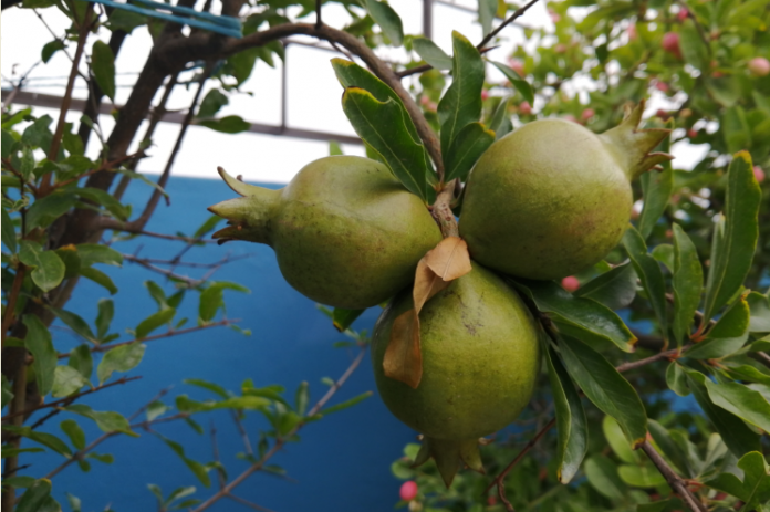 হোম কৃষিঢাকার উপশহর মিরপুরে আবাসিক বাড়ীর উপরে ছাদ কৃষির বাগানে একটি বোঁটায় ডালিম...