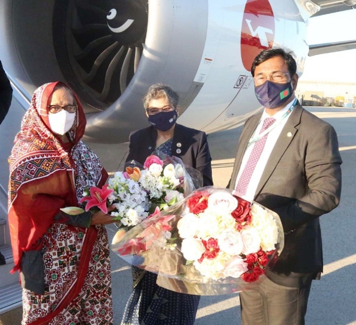 প্রধানমন্ত্রীর প্রেস সচিব ইহসানুল করিম বাসস’কে জানান, ‘ বিমান বাংলাদেশ এয়ারলাইন্সের একটি ভিভিআইপি চার্টার্ড ফ্লাইট স্থানীয় সময় রোববার বিকেল ৫টা ৩০ মিনিটে প্রধানমন্ত্রী এবং তাঁর সফরসঙ্গীদের নিয়ে নিউইয়র্কের জন এফ কেনেডি আন্তর্জাতিক বিমানবন্দরে এসে পৌঁছায়।’
