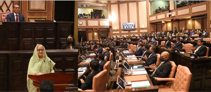সংসদের ভাষণে শেখ হাসিনা আরও বলেন, ‘আপনার উন্নয়নের যাত্রা, এলডিসি থেকে মধ্যম আয়ের দেশে আপনার সফল উত্তরণ প্রত্যক্ষ করে আমরা বিশেষভাবে উৎসাহিত হয়েছি এবং আমরা আশাকরি, বাংলাদেশ ও মালদ্বীপ পরিপূরকতাগুলোকে কাজে লাগাবে।’ প্রধানমন্ত্রী বলেন, এই সুন্দর দেশের গণতন্ত্রের প্রাণকেন্দ্র, রাজনীতি ও নীতির এই আবাসস্থলে মজলিসের বিশিষ্ট সদস্যদের মাঝে ভাষণ দেওয়ার সুযোগ পেয়ে তিনি গভীরভাবে সম্মানিত।
