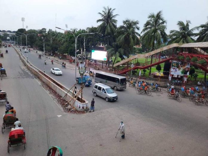 করোনাভাইরাসের উচ্চ সংক্রমণ ঠেকাতে সরকার ঘোষিত সপ্তাহব্যাপী কঠোর লকডাউনের প্রথম দিনে। বিধি-নিষেধ বাস্তবায়নে ভোর থেকেই দেশের বিভিন্নস্থানে ব্যাপক তৎপর রয়েছে আইনশৃঙ্খলা রক্ষাকারী বাহিনী। জেলাসমূহের গুরুত্বপূর্ণ সড়কে চেকপোস্ট বসিয়ে যানবাহনে তল্লাশি ও পথচারীদের বাইরে বের হওয়ার কারণ জিজ্ঞাসা করছে পুলিশ। অহেতুক ঘোরাঘুরির কারণে কোথাও-কোথাও জরিমানা করা হচ্ছে। ঢাকার মিরপুর ১০ নাম্বার গোল চত্বর থেকে বিকেল বেলা তোলা ছবি (বৃহস্পতিবার ১ জুলাই, ২০২১)।